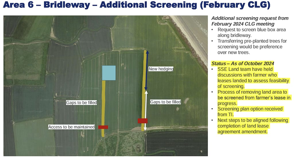 Additional screening request in progress – lease for land area requested to be screened in review with lease holder. Lease to be amended to allow SSE-Equinor to take back land when required. Draft plans received from TI – next steps to be agreed following land lease confirmation.